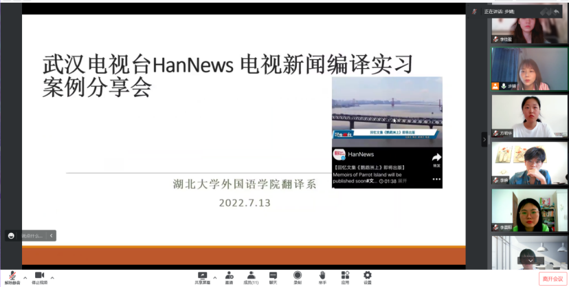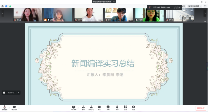 7月13日上午10:00,公司翻译系2019级和2020级暑期武汉电视台编译实习生们在腾讯会议室展开阶段性复盘小结会,就上一阶段的实习工作进行回顾,就工作中遇到的编译和配音问题进行讨论。本次会议由公司翻译系副主任步婧老师主持,她首先对同学们上一阶段完成的任务给予了肯定,同时对同学们遇到的问题进行了全面而细致的解答。