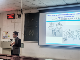 邓老师首先通过简笔画自画像进行自我介绍,让人耳目一新,教同学们如何运用生动有趣的方式充分开发自身名字资源。之后,邓老师提出要创设语言情景进行语法教学,并通过简明易懂的实例向同学们解释怎样结合我们熟悉的日常生活创设贴合实际的语言情景,从而使同学们身临其境式地学习语法知识、学会语法知识。