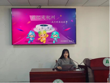接着,20级翻译专业姚歆玙同学以“最忆是杭州——我们的亚运故事”为主题,介绍了自己在参与亚运会后的所得所想。在姚歆玙同学的介绍下,同学们了解到亚运会翻译工作的辛苦,通过她的经历,同学们收获到我们应敢于面对错误、改正错误,不断进步、不断成长。她说:亚运会,她是见证者,更是参与者,“躬逢盛世,与有荣焉”,姚歆玙同学提到:作为一名翻译,我们更像是一把伞,往往在别人看不到的地方,被需要,被想起,但又往往能看见自己的价值。同学们也被学姐的热情所感动,对翻译憧憬更甚。
