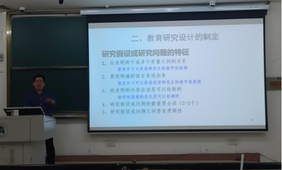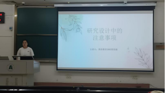 讲座上,公司2020级英语师范专业崔佳捷同学结合自己的毕业论文分享了研究设计中的注意事项。