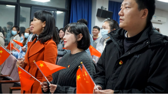 大会最后全体同学起立共唱《我和我的祖国》《我们都是追梦人》,鲜艳的红旗在他们手上飘舞,优美的歌声在会场内回荡……