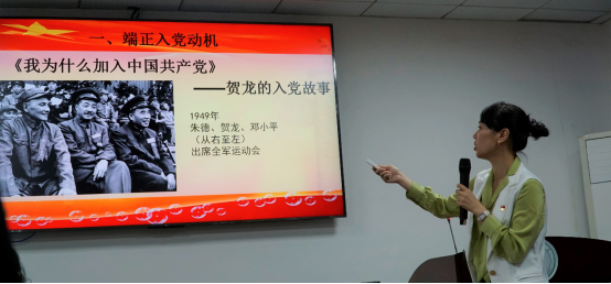 接着通过分享贺龙的入党故事来告诉大家:“谈入党初心,首先要对党有感情,这份感情来源于理论学习,来源于身边故事的熏陶”。