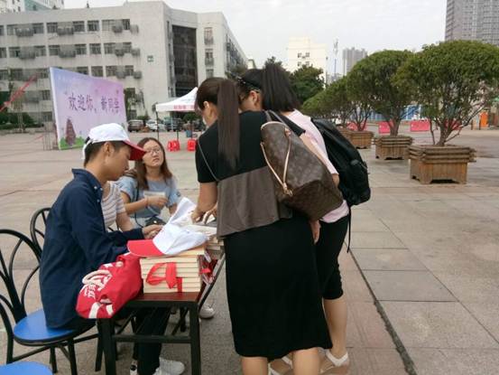 7日,新生及其家长陆陆续续到校。思睿广场中一张摆满了书、写着“外院迎新”桌子吸引了不少新生驻足。据了解,桌上书籍是外院学长学姐免费捐赠给新生的入学礼,外院新生可凭入学通知书免费得到一本书。