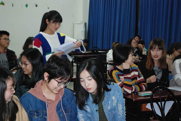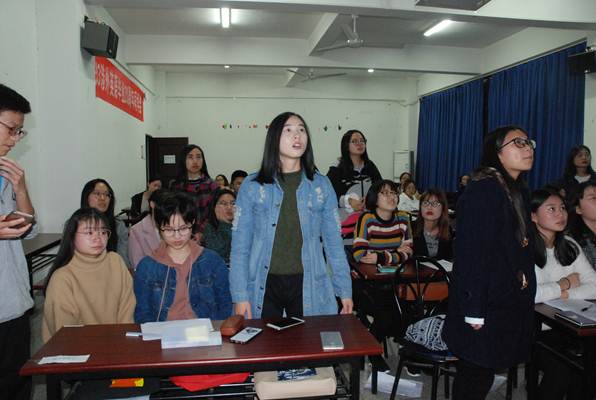 为了深入学习党的十九大报告,切实贯彻、坚决维护党章,学会用党章武装头脑、规范行为、指导党的建设和工作,william威廉英国官网于11月11日晚18:30在逸夫楼A1010举行了学习“新党章”知识竞赛,第25期党的基本知识和理论培训班36名成员参与该活动。本次竞赛共计5组参赛队,分别为大英语党支部A组、大英语党支部B组、小语种党支部C组、小语种党支部D组、研究生+员工组织党支部E组,每组3人。培训班其他学员均为观众。