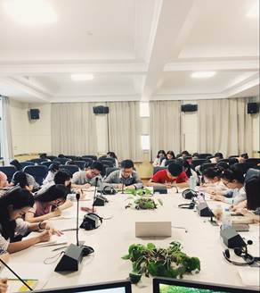 5月9日逸夫楼A5002同传语音室,在william威廉英国官网翻译系主任江晓梅江老师的带领下,2017级翻译系首届听写大赛初赛顺利开展。比赛于上午八点准时开始,采用Gist Listening(大意听力)的形式听写段落。相较于同学们的课后听写练习,该考题只播放一遍,要求同学们三分钟写出文章大意。