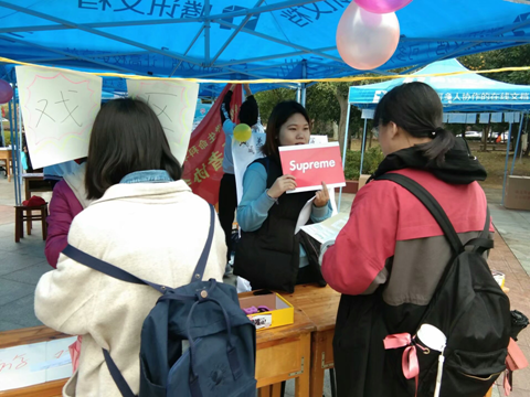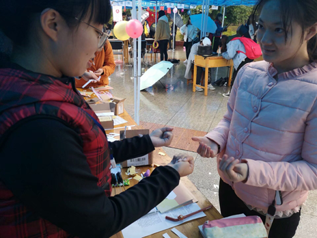 据悉,项目展示区是最具外院特色的活动区域。区域内展示了外院志协三大特色项目:“松柏青常在”、“英乐之声”和“外语宣讲队”。主讲人黄悦为参与者们详细讲解了外院志协在福利院、敬老院以及校史宣讲中的具体志愿行动,活动现场大家跟着工作人员学做手指操,参与者们制作的串珠手链将作为日后送给福利院小朋友们的礼物。午后,来自外院的郑旭元和吴诗语带来了一首暖场歌曲:《A million dream》。值得一提的是,华中师范、中南财大、武科大等外校的同学也参与到活动中。