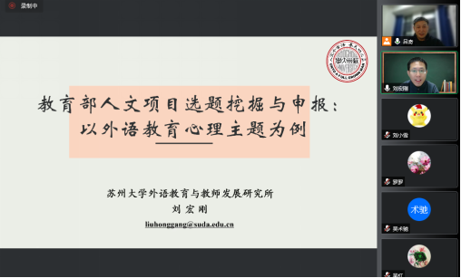 11月23日,苏州大学刘宏刚教授应公司邀请,以“外语教育心理”主题为例,为公司教师作“教育部人文项目选题挖掘与申报”专题学术讲座。讲座采用线上的方式进行,由公司副经理吕奇教授主持,60余位教师参加讲座。