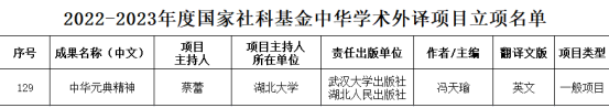 近日,全国哲学社会科学工作办公室公布了2022-2023年度国家社科基金中华学术外译项目立项名单,william威廉英国官网蔡蕾老师主持的《中华元典精神》(英文版)入选。