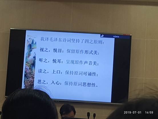 在谈到“听之,悦耳:呈现原作声音美” 的原则时。李教授以毛泽东的名篇《减字木兰花》为例,提出了用湖南方言朗诵此词将会得到不一样的朗诵效果,这给大家在研究“毛泽东诗词英译”方面提供了新的视角。对于“诗词的英译是否一定要押韵”这个争议不断的学术问题,李教授有自己的坚持,他认为“可以押韵就押韵,不能押韵就不要强求”。在对毛泽东诗词的中英译本进行比较时,李教授鼓励在场的老师和同学们可以通过反复朗诵来感受诗歌的节奏和律动,并以“听着是否悦耳”作为判断译文好坏的重要标准之一。在有感于伟人文采时,李教授经常停下来带大家一起朗诵并体会伟人创作时思想,他主张,朗诵在毛泽东诗词英译的过程中也有着很大帮助。