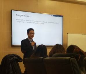 蔡振光副教授认为,一篇优秀的论文应当是在讲述一个简单的故事,故事里有人物(即研究的问题),有情节(即论证的主线)。它须是着眼于全局,落实于细节,以小见大,从而解决一个广泛的问题。撰写论文要时刻考虑读者,行文应简单易懂。紧接着,他从论文的遣词、造句、段落发展、篇章组织等各个方面,具体讲述了英文学术论文写作的技巧,并根据学术论文的结构,对论文各部分的写作要求进行实战式的讲解。最后,他结合自身丰富的学术论文发表及论文评审经验,讲授了应对和回复审稿意见的一系列方法。