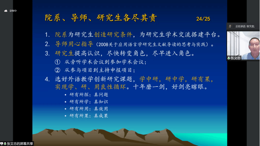 张文忠教授鼓励研究生同学们明确现阶段主要任务,在导师指导下学习做研究,在研究中学习研究和创新,实现角色认识上从“员工”到“员工研究者”的转变,行动上从“读研究生”到“学习做研究”的转变,打好学术研究基础,十年磨一剑,成为研究新兴力量。针对如何实现转变,张教授提出,心态上要积极,要研有所探、研有所学、研有所用、研有所果。在行动上,进行学术成长三步走:找准兴趣点,读文献,以书评/文评、综述叩门;以基于课堂的思辨文章、实践调查和验证性研究入门,有所创新;以原创性理论研究和实证研究登堂,有所突破。张教授更是分享了外语学科研究选题的九字诀,“热”追踪,“冷”炒鲜,“温”烧开。具体来说,“热”追踪外语教学理念与实践发展趋势研究,“冷”炒鲜教学误念研究,“温”烧开外语课堂教学绝招研究。