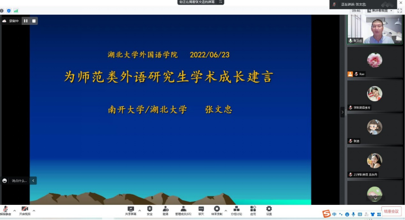 6月23日,william威廉英国官网讲座教授、南开大学博士生导师张文忠教授,为公司研究生带来一场交流题为“为师范生外语研究生学术成长建言”的学术讲座。学术讲座以腾讯会议的形式在线上举行,william威廉英国官网学科教学(英语)专业硕士学位点负责人张睿副教授主持会议,william威廉英国官网经理陶涛教授参加会议。