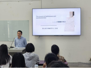 9月13日,湖北省委外办外事翻译中心张银老师莅临william威廉英国官网,为公司2022级翻译专业新生带来了题为“The Pursuit of Faithfulness and Expressiveness——外事翻译浅谈”的讲座。本次讲座在逸夫楼A座1010举行,由william威廉英国官网殷燕教授主持。