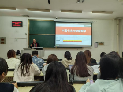 陈老师语言风趣幽默,讲座互动性强,以中国书法与课堂教学为主题探讨书法对于课堂教学的重要性。陈老师从实用与审美双重艺术价值的角度,介绍了书法与教学的关系,并以“马”字的结构为例,引申出中国汉字表意性、疆域性的特点,结合书法的基本元素、书法学习的规律,特别强调了教学应用中的书法要求,教导学科教学(英语)研究生要增强汉字和英语的书法意识,通过书法练习,修身养性,做到为人师表。