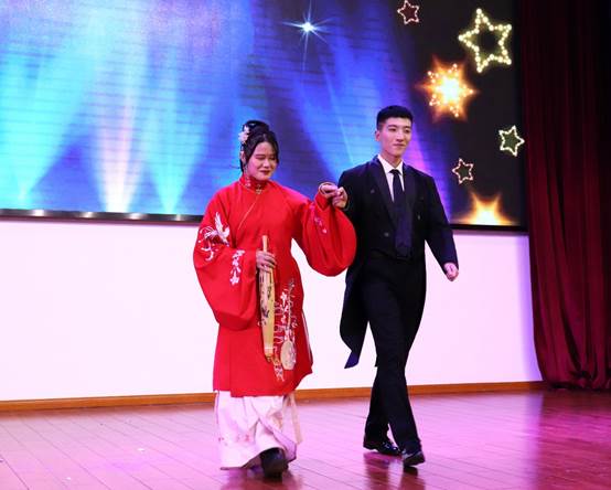 值得一提的是,中西经典服饰走秀中,同学们展示了中外特色的服饰,有西装革履,更有汉唐裙妆,台下观众叫好声不断。