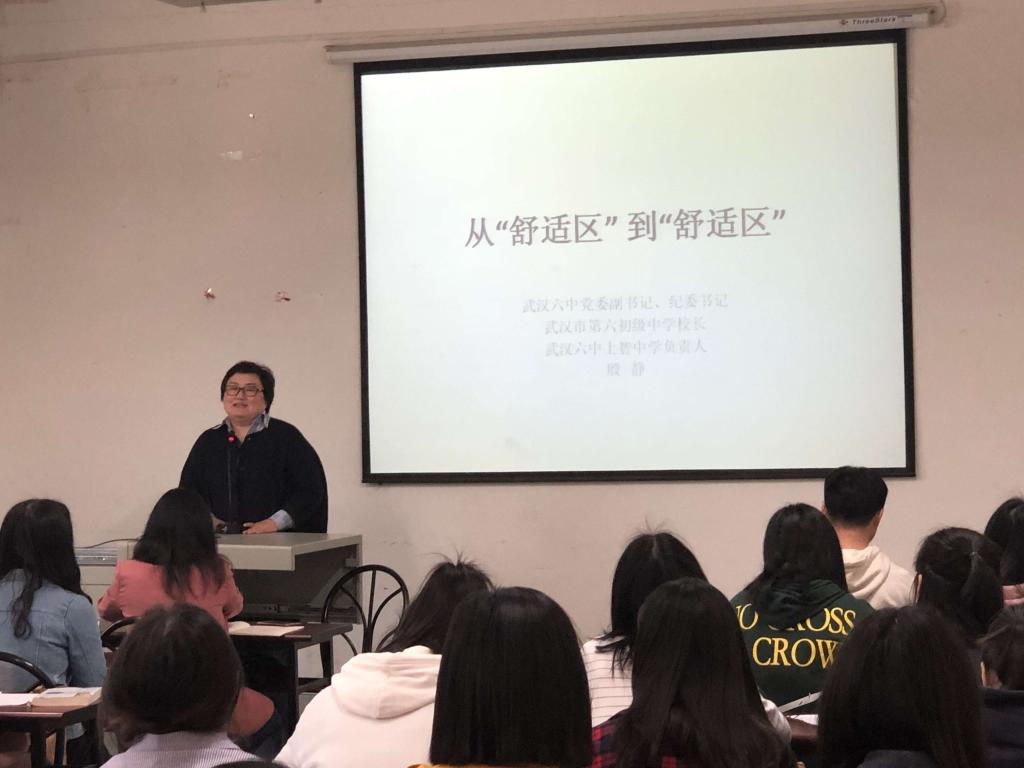 4月12日下午2点,武汉六中党委副书记、纪委书记、武汉市第六初级中学董事长兼武汉六中上智中学负责人殷静应邀深入公司王家芝教授主干课堂,为18级学科英语教硕班同学开展中学公司产品智慧管理专题讲座。讲座正式开始前,公司招就处李莉处长、谌瑾副处长、公司林二友书记、占婧副书记热情接待殷书记,深入交流实习招聘、教师交流等事宜,推进公司与武汉六中共建合作事宜。
