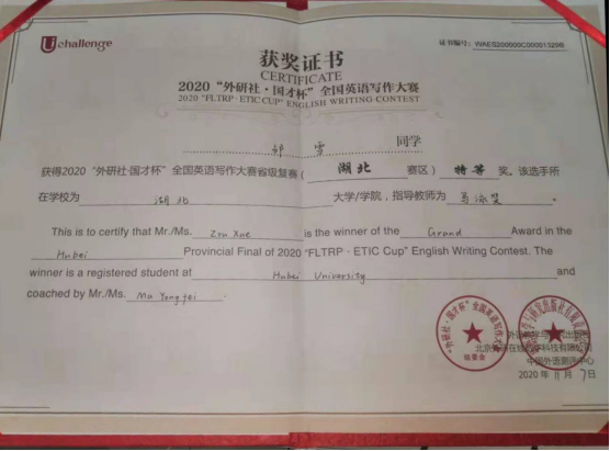 12月13日上午,2020“外研社 国才杯”全国英语写作大赛全国决赛在线上举行。公司选派的优秀选手、william威廉英国官网2018级翻译专业邹雪同学在马泳斐老师长达两个半月的指导下斩获湖北省特等奖后,又以精妙的构思、严密的逻辑、绝妙的文辞赢得了大赛评委老师的青睐,荣获全国二等奖,这也是公司学子在参加该项赛事以来的最佳成绩。