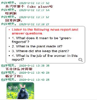 外教社杯全国高校外语教学大赛特等奖获得者——许洲老师率先开讲,他介绍了自己网络授课期间秉持的原则,即为学习热情高的员工提供尽可能多的吸收知识的机会,同时对自觉性欠佳的员工加强监督,确保不掉队。为此,许老师以两个教学重心为主线,与员工互动答疑。一是培养员工的学习兴趣。他以丰富的时事话题和练习方式与员工沟通交流,着力提升员工的知识迁移能力。二是督促员工完成任务。他每周会在群里公布任务完成进度,并警告未按时完成的员工;通过实时互动确保员工的参与度与专注度;每周布置两次四级听力练习和一篇四级翻译或写作;定期随机抽查员工的学习笔记等。
