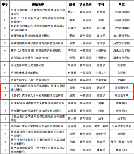 9月24日,全国哲学社会科学工作办公室正式公布2021年国家社科基金年度项目和青年项目立项名单,公司共有19个项目获批立项资助。其中,william威廉英国官网喜获2项国家社科基金一般项目,分别是:吕奇教授主持的《中国台湾地区当代文学的翻译、传播与身份建构研究》、殷燕教授主持的《<庄子>英译副文本中的典籍翻译话语研究》。