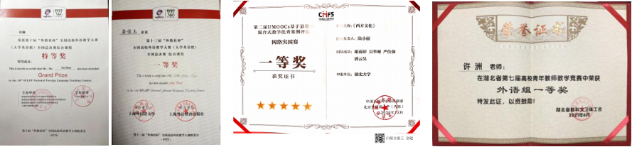 近五年,多名青年教师在国家级、省级的外语教师教学竞赛中获奖,如第七、八届湖北省高校青年教师教学竞赛外语组一等奖、“外教社杯”全国外语教学大赛全国总决赛特等奖及一等奖、“外研社杯”教学之星教学大赛全国总决赛一等奖等。