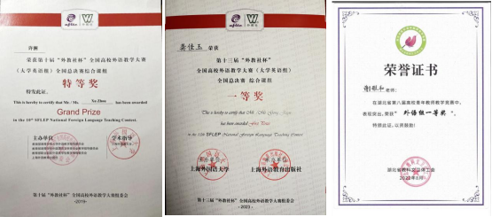 2019年《英语演讲艺术》获评全国“基于MOOC的混合式教学优秀案例”二等奖;2024《英语演讲艺术》获评全国“在线开放课程/MOOC教学优秀案例;2020年《西方文化》获得“第二届UMOOCs基于慕课的混合式教学优秀案例”三等奖。
